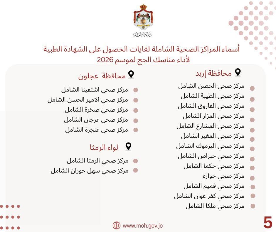 أسماء المراكز الصحية الشاملة لغايات الحصول على الشهادة الطبية لأداء مناسك الحج لموسم 2026 #وزارة_الصحة #وزارة_الأوقاف_والشؤون_والمقدسات_الإسلامية